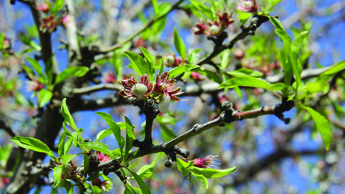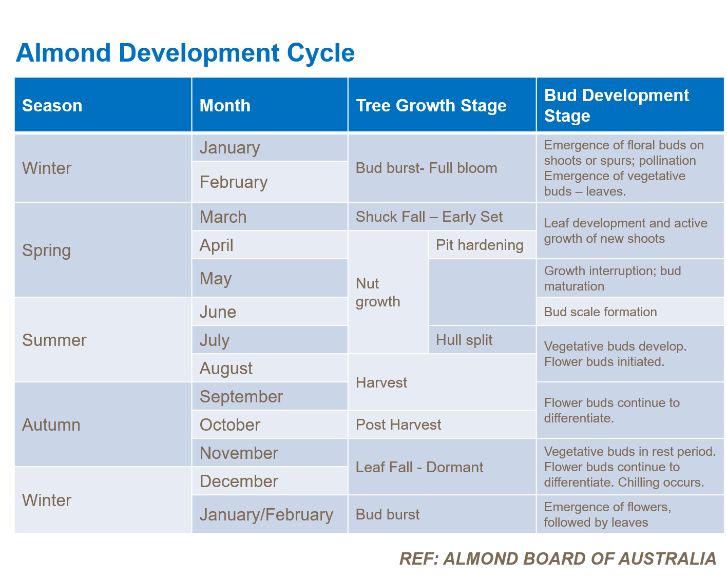 The table below gives the typical bud initiation and development cycle for Northern Hemisphere almonds. Compared to other nut species, bud burst is relatively early. Flowers open in January/February, just before the leaf buds.