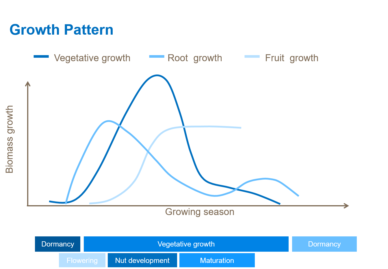 Root growth commences in early spring – in almonds when leaves are at 70% expansion – and diminishes through the summer. There is a second, but much smaller period of growth in late autumn/early winter.