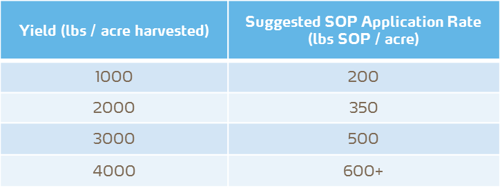 SOP applied in sandy soils or soils with low cation exchange capacity can be split into spring and fall applications. While weather conditions may prohibit this practice, consult with your advisor as to whether this might be a beneficial course of action.