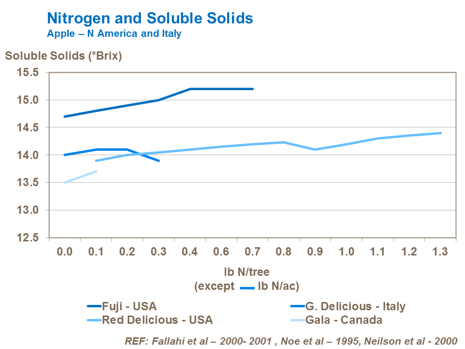 Nitrogen has a positive effect on the soluble solids content of apples. Potassium also plays an important role on sweetness, measured by oBrix, as shown in trials in India. °Brix is used to approximate the TSS content because the soluble sugars usually represent more than 75 - 85% of the soluble solids.