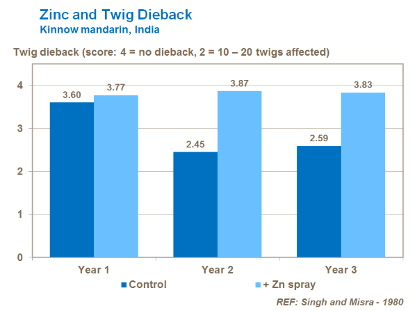 Twig die back in citrus plants is a common symptom of zinc deficiency. It can be corrected using foliar sprays.