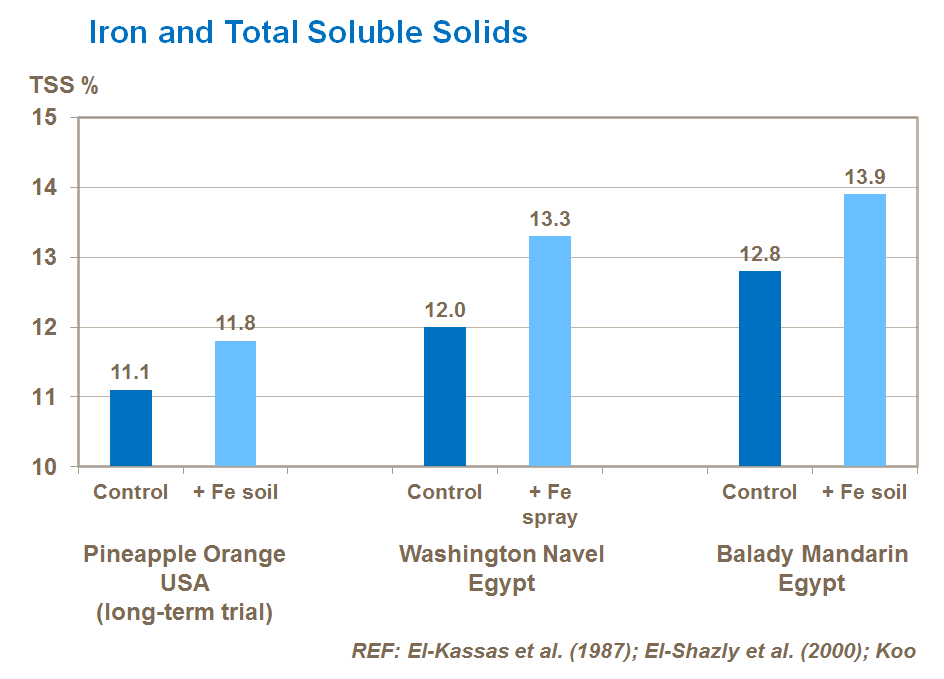 Use of iron effectively increases the level of sugars in the fruit. Trials show increases where iron is deficient across Pineapple oranges, Washington navels, and Balady mandarins.