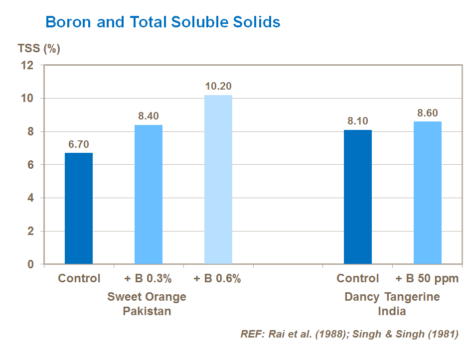 Boron increases the levels of sugars in the fruit. In these trials - particularly on sweet orange - there was almost a 50% increase in TSS from use of a 0.6% application.