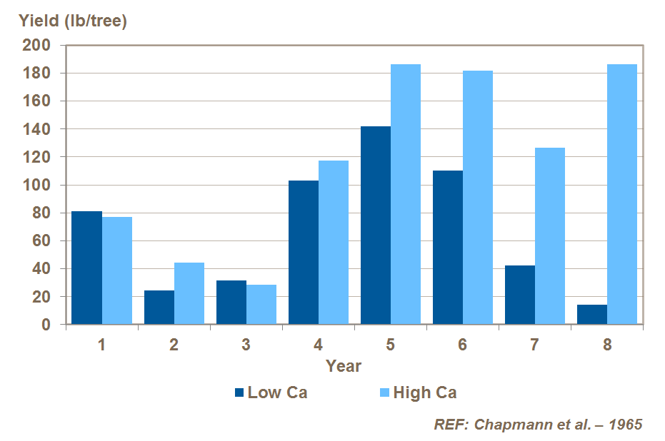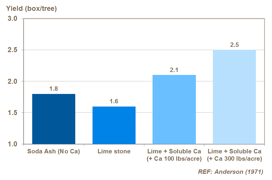 Annual, cumulative use of calcium produces high yields. This was confirmed in a controlled, low pH environment experiment in Florida where high rates of calcium on its own increased tree growth rate and yield of navel oranges over an eight year period.
