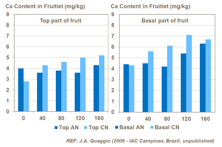 Annual, cumulative use of calcium produces high yield. Calcium nitrate ensures higher yields compared to ammonium nitrate. Fertigation using calcium nitrate is a highly effective way of maximizing Ca nutrition and yield. Significant fruit set improvements come from calcium nitrate applications made immediately prior to and during flowering.