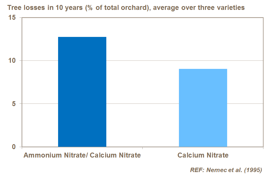 Research in Florida across three citrus species, confirms that tree loss due to citrus blight (Fusarium spp.) is significantly lower where calcium nitrate is the main form of fertilizer. For the most responsive cultivar Hamlin, 15% of trees treated with ammonium nitrate as part of the fertilizer programme were unproductive after ten years, compared to just 7% where calcium nitrate was the only form of N-fertilizer used.