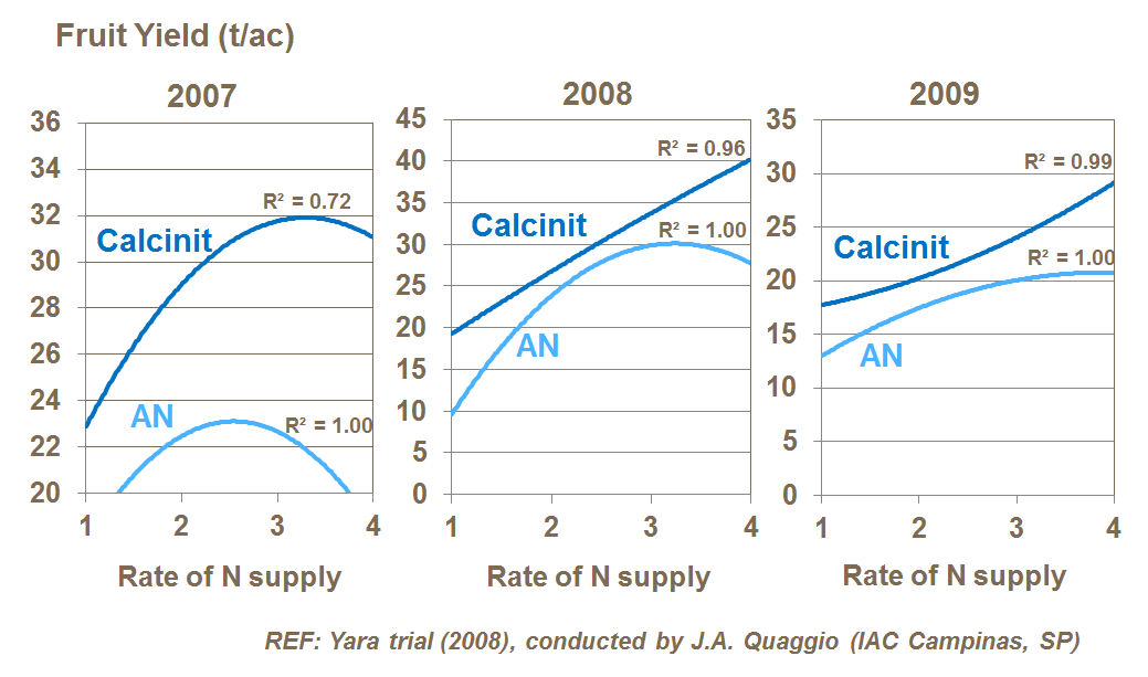 Calcium nitrate ensures higher yields compared to ammonium nitrate. Maximum yields in this fertigated trial (Valencia oranges, Brazil) were achieved with lower N rates applied by calcium nitrate. In a long-term series of trials, calcium nitrate has consistently proven to be the most effective form of fertilizer for producing high orange crop yields.