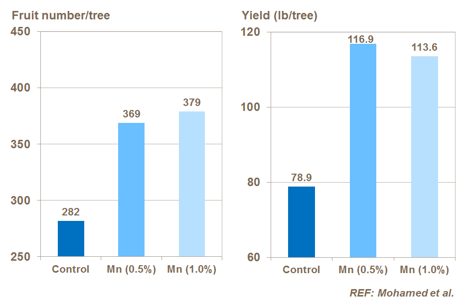 Both soil application and foliar sprays of manganese increase yields in deficient trees. This is mainly as a result of increasing the number of fruit per tree.