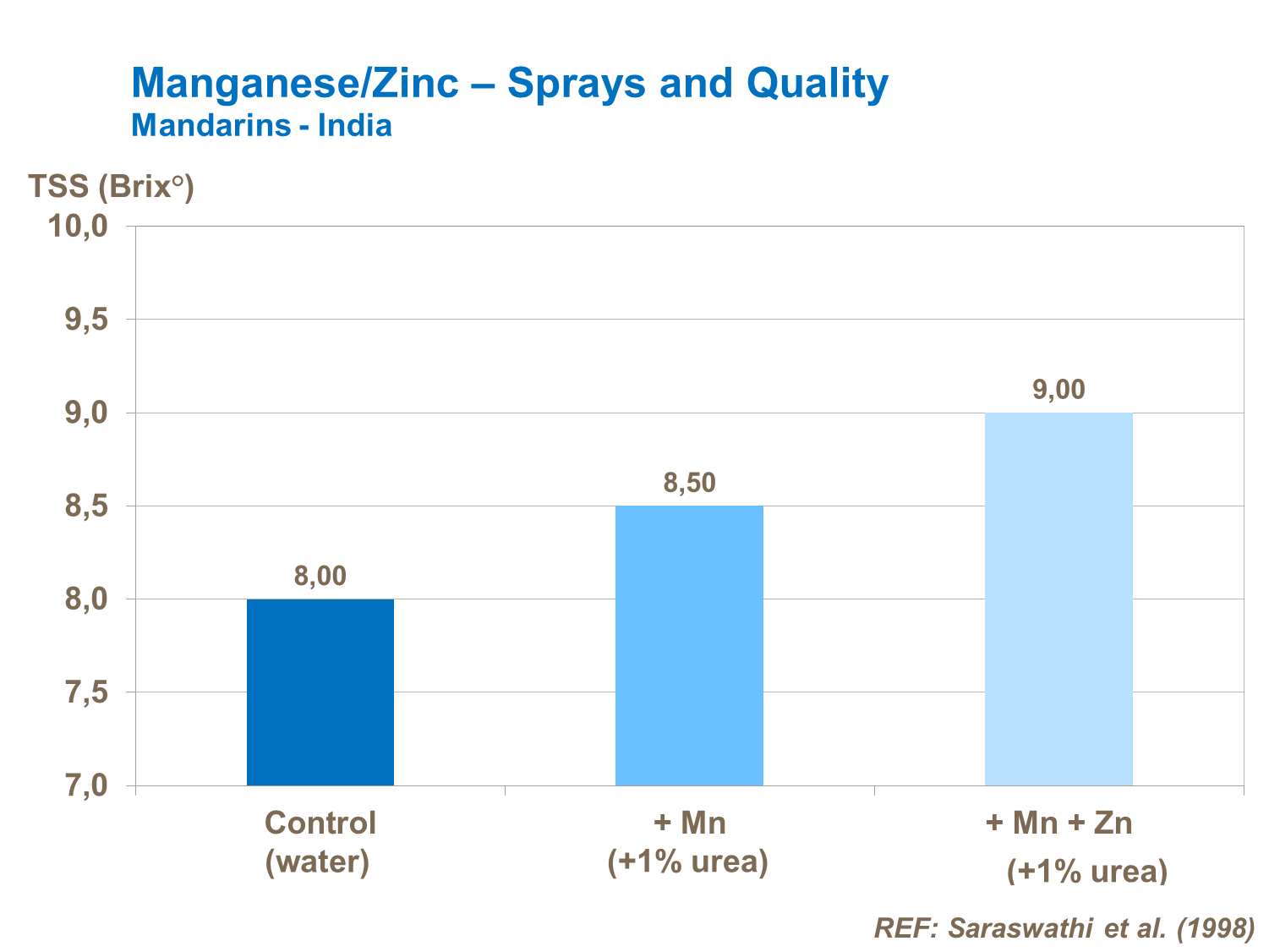 Manganese, often in association with zinc, increases TSS contents of the fruit. The image above shows quality improvement on mandarins in India.
