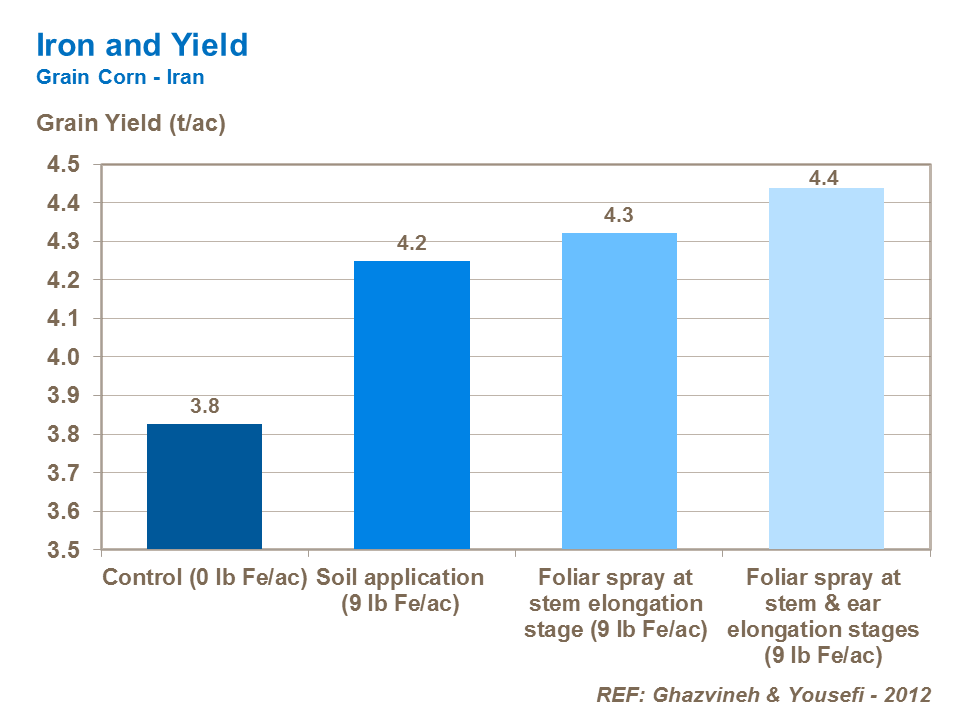 Corn plants are only slightly sensitive to lack of iron. Where deficiencies occur, foliar applications – particularly those made at later stages of leaf growth and at early stem extension – have been shown to increase corn yield.