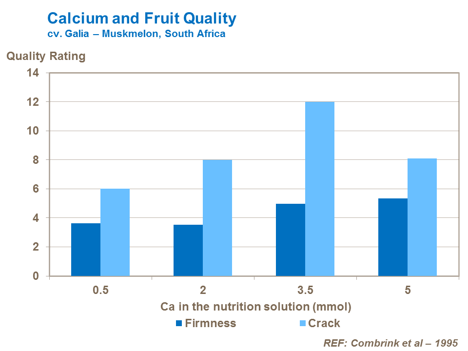 Lack of melon firmness can be a result of poor calcium nutrition. High levels of calcium thicken cell walls and firm the fruit. However, calcium needs to be balanced with adequate supplies of boron to prevent cracking. Trials confirm that calcium nitrate is particularly effective at ensuring good fruit quality.