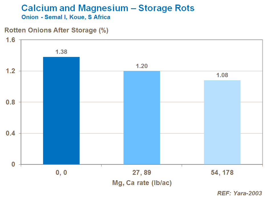 While only relatively low levels of calcium are found in the bulb, these levels are critical for storage quality, improving the strength of cell walls. Trials show that magnesium, applied alongside calcium, helps improve the shelf life of onions by reducing the level of rot during storage.