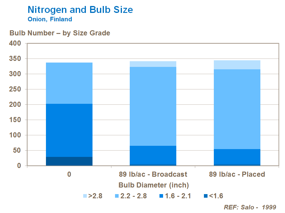 Optimum nitrogen supply is important for onion size. Nitrogen supports production of leaves and hence, increases the number of onion bulb scales and the size of the harvested bulb. Because these crops are shallow rooted with poor root branching, it is common practice to use split N applications to maximize uptake efficiency. Placement has been proven to be more effective than broadcasting.