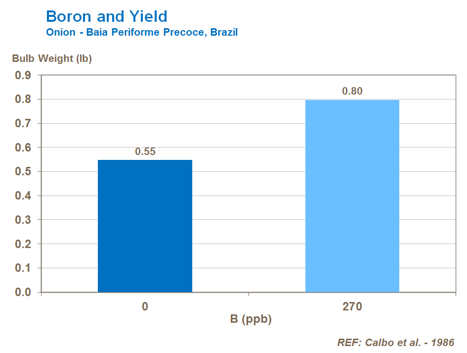 Trials confirm that boron has a positive effect on onion yield by increasing bulb weight. It is important to maintain the correct balance of calcium, nitrogen and boron in the soil as high Ca and high N levels can reduce boron uptake.