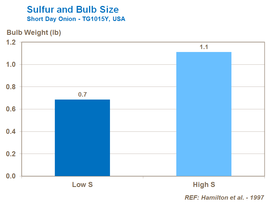Sulfur is important for onion bulb weight and yield, and helps to improve the crop’s utilization of nitrogen. However, care has to be taken as high rates, particularly in S-rich soils, can have a detrimental effect on yield. It has also a marked effect on the pungency of the onion through increasing the pyruvic acid content of the bulb – a key quality characteristic.