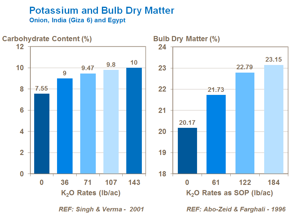 Potassium is particularly important where high N rates have been applied (if high yielding systems). In these situations, increasing dry matter and sugar accumulation in the bulb helps maintain yield.