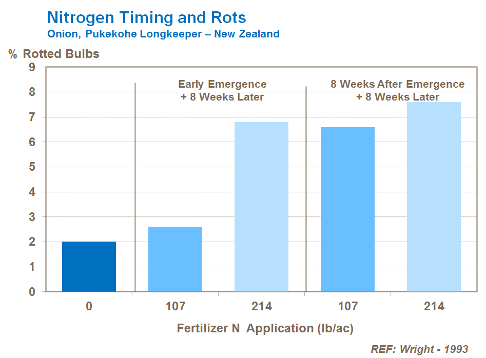 Later applications of nitrogen are the main cause of increased incidence of thick necks and rot in storage as well as for delayed maturity.
