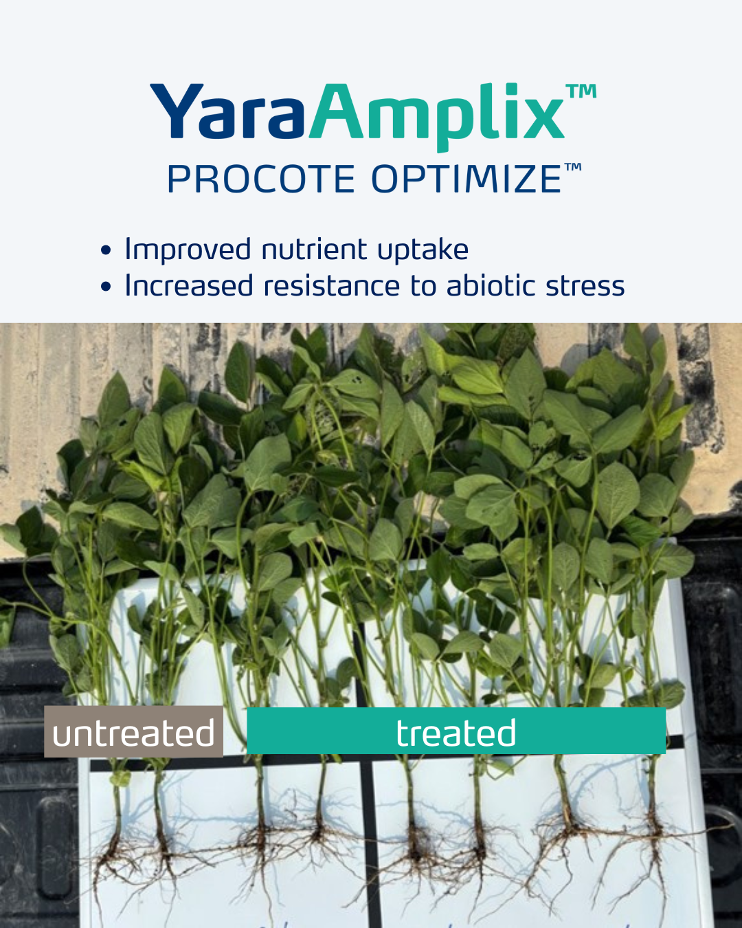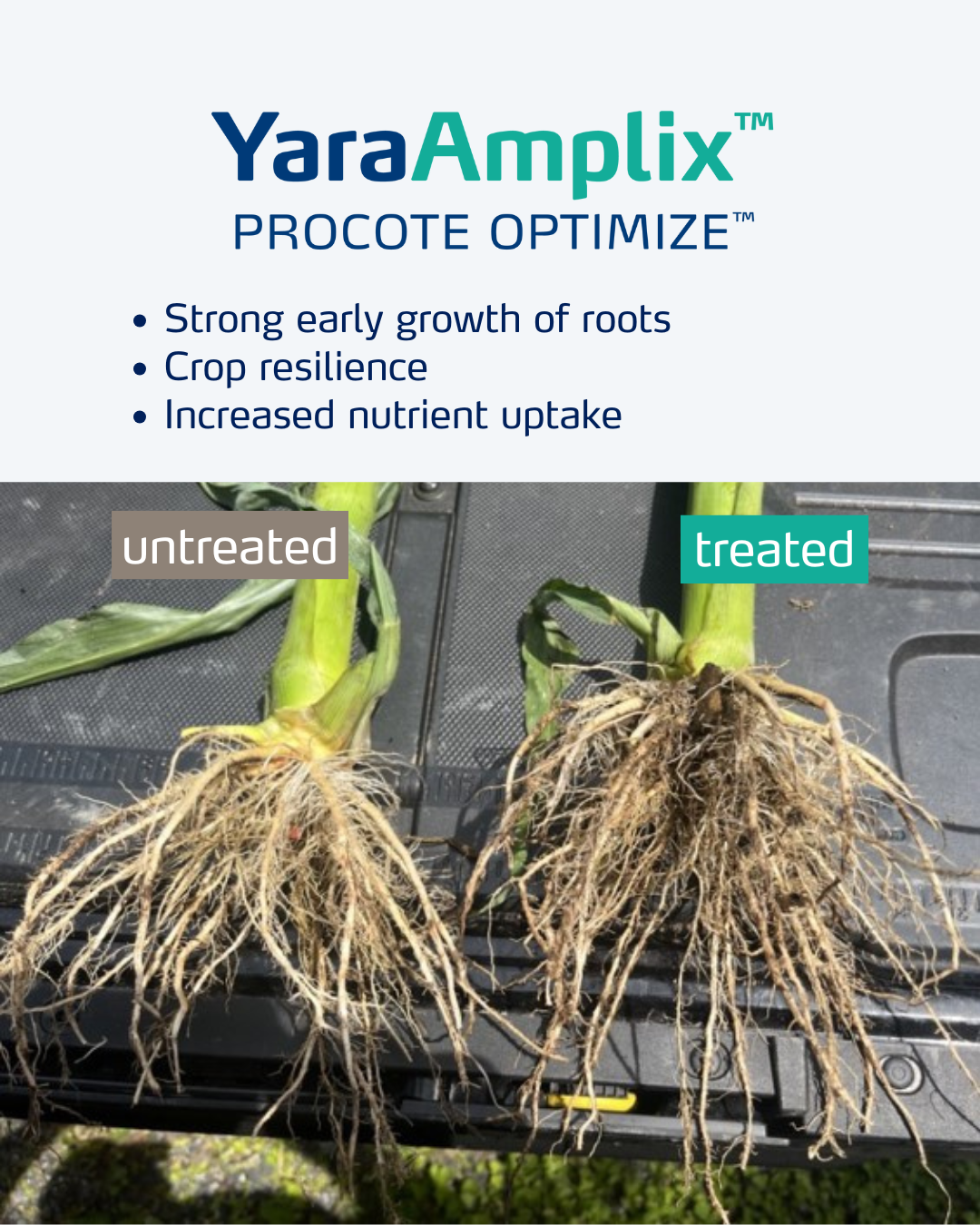 YaraAmplix PROCOTE OPTIMIZE promotes strong early growth of roots, improves crop resilience and increases nutrient uptake of not only phosphorus but eight other nutrients (N, K, Ca, Mg, S, B, Mn, Zn).