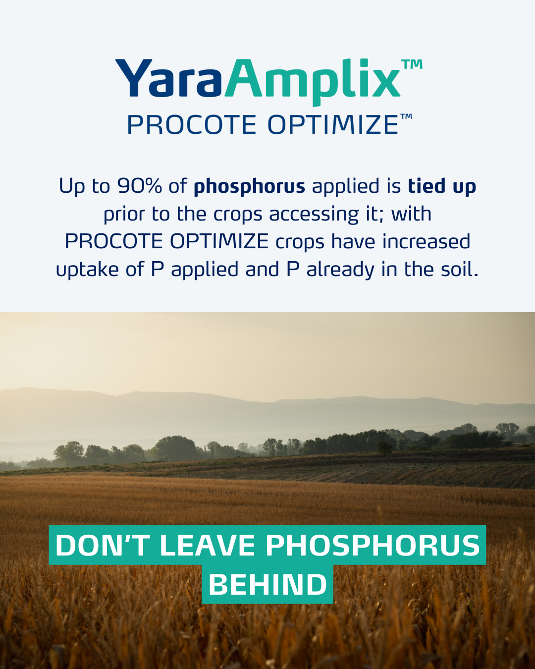Up to 90% of phosphorus applied is tied up prior to the crops accessing it; with YaraAmplix PROCOTE OPTIMIZE crops have increased uptake of P applied and P already in the soil. Don't leave phosphorus behind.