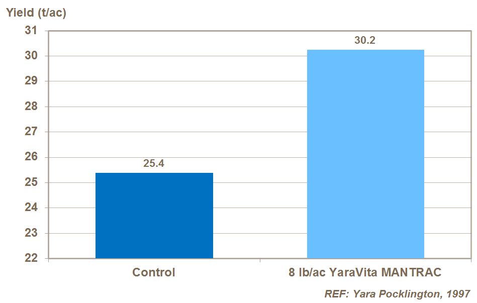 Manganese behaves in a similar manner to magnesium in the potato plant, supporting a number of biochemical processes. However, unlike magnesium, manganese is extremely immobile in the plant and moves only upwards via the xylem to the leaves. Once in the leaves, there is no transference to other parts of the plant.