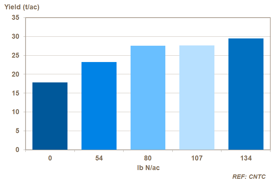 The total amount of nitrogen supplied will vary according to the length of time the canopy needs to be maintained and any potential losses such as leaching. Optimum total N rates vary with soil type and previous cropping history.