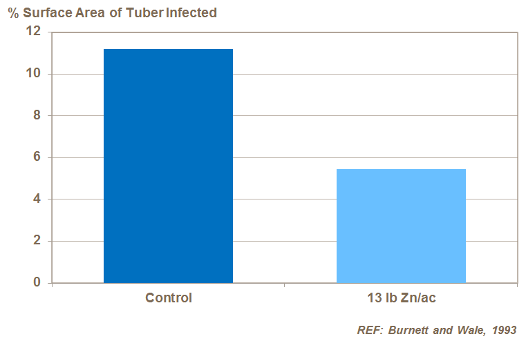 Zinc is commonly used to suppress powdery scab where the innoculum is at low levels. Only soil applications are likely to provide sufficient zinc to have an effect on powdery scab, as trials in Scotland show.