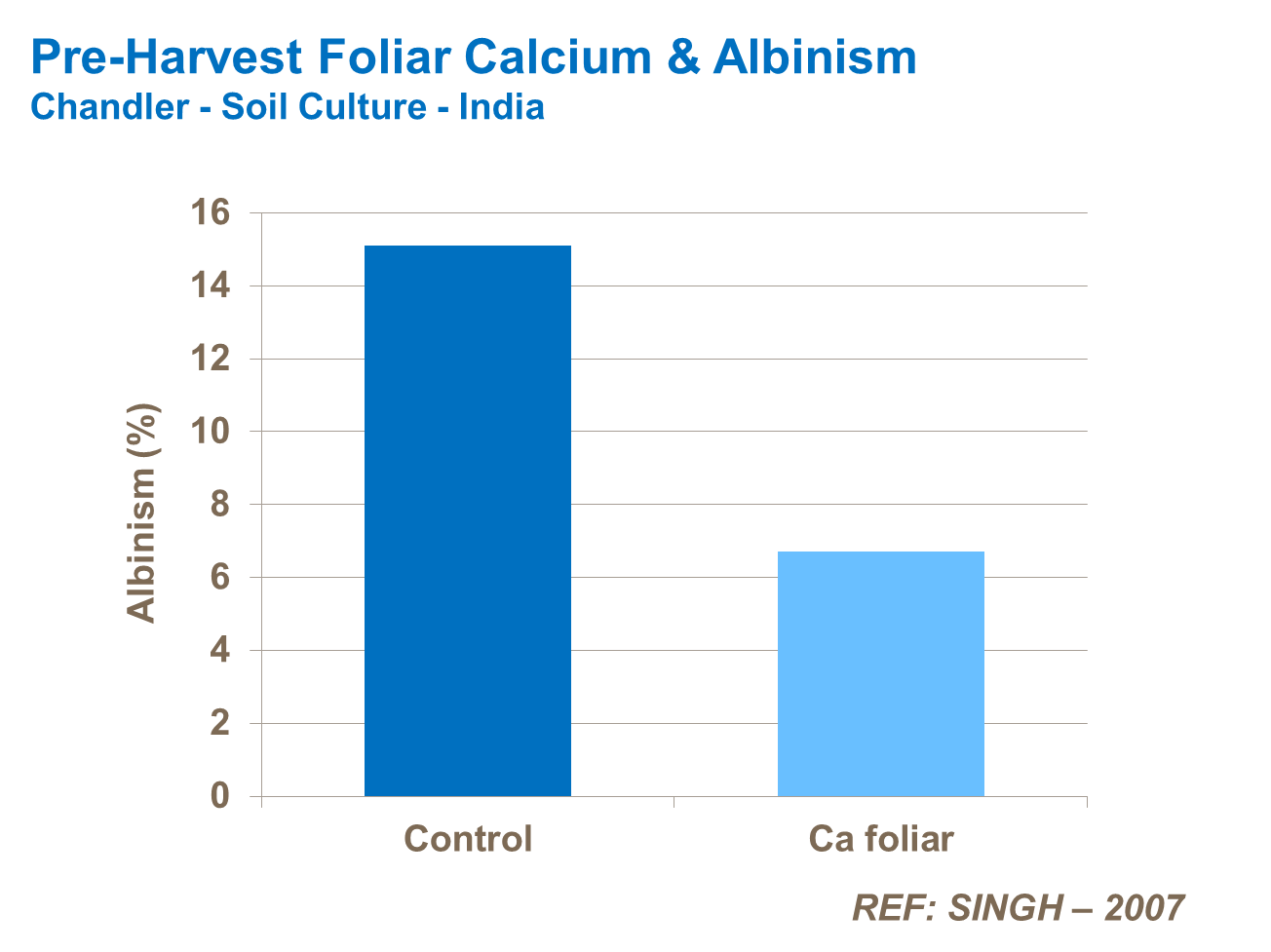 Calcium also helps to reduce levels of mold on fruit post-harvest. This calcium can also be applied pre-harvest as a foliar application. Ca reduces albinism, maintaining fruit coloration through increasing anthocyanin levels during maturity.