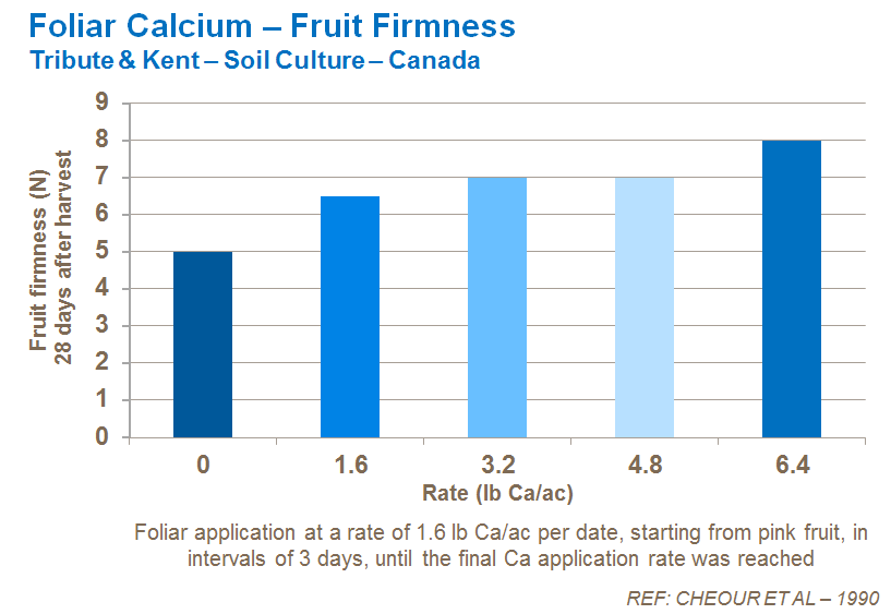 However, excessive rates of calcium at the expense of other cations can reduce fruit firmness and shelf life. For this reason it is important to keep calcium applications in balance with other cations such as potassium and magnesium.