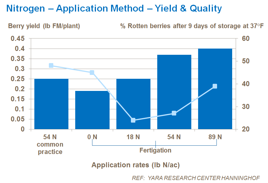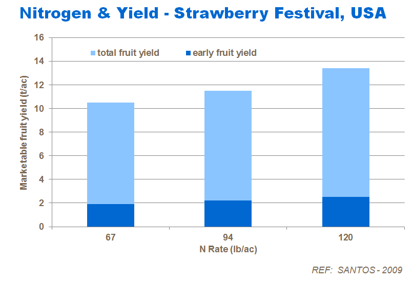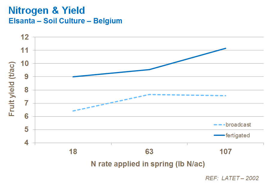 Timing of N is also critical and programs need to be tailored to deliver enough leaf growth and strong fruit set without creating issues during fruit fill and at harvest. In field grown strawberries, this will mean focusing upon nitrogen applications in the fall and also early in the spring - to strengthen and build the plant and improve fruit production.
