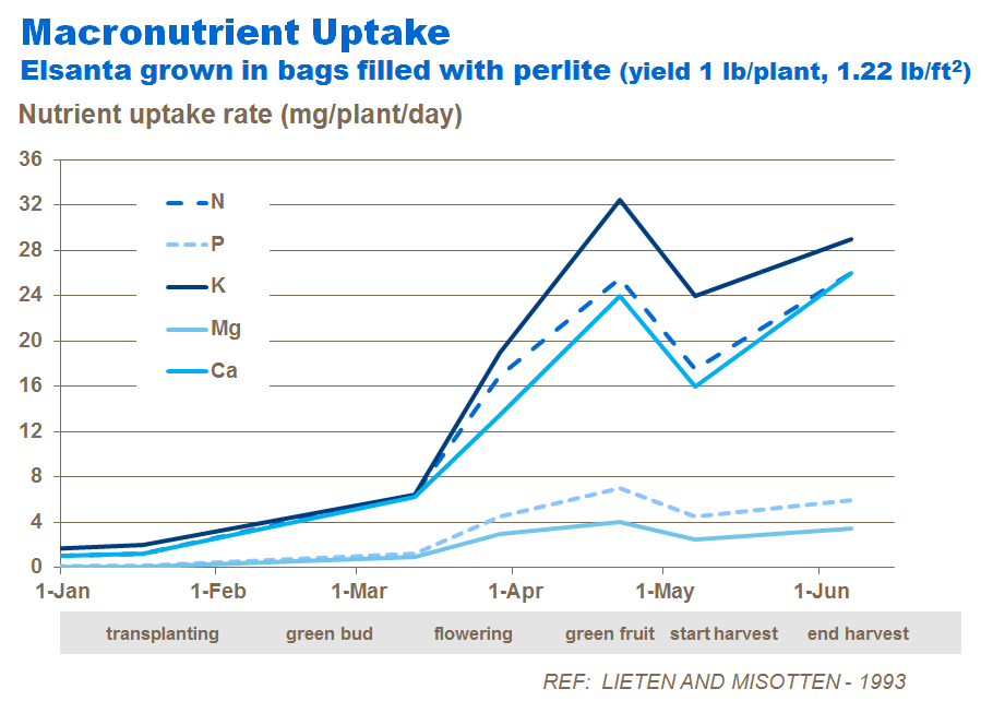 Nitrogen uptake increases during the vegetative stage and reaches a peak just before the fruit starts maturing.