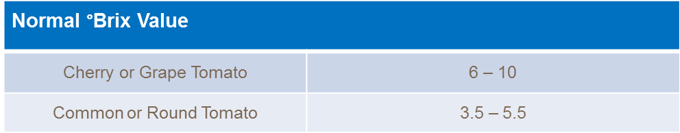 The °Brix content of the finished tomato product is largely controlled by the processor and manufacturing process. However, some processors do pay a higher price for higher dry matter tomatoes. In general, smaller, cherry tomatoes have a higher brix ratio and are sweeter than larger round or common tomatoes.