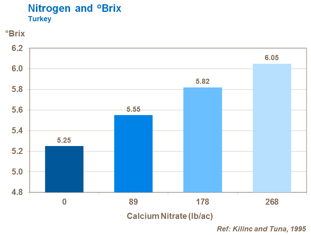 High rates of nitrate applied as calcium nitrate increase levels of total soluble solids as measured by °Brix.