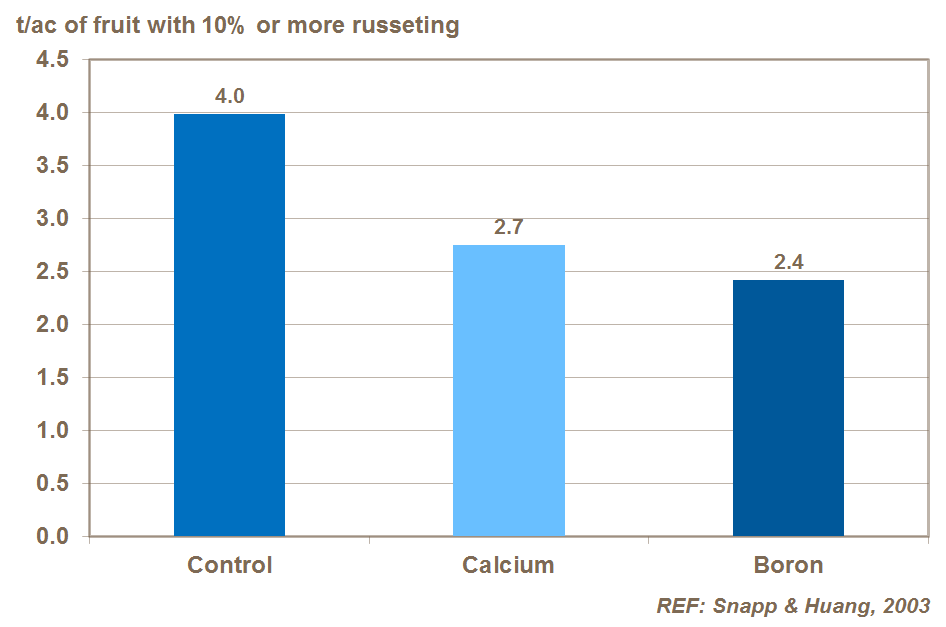 Lack of boron (and calcium) increases the incidence of russeting, as shown in US trials.