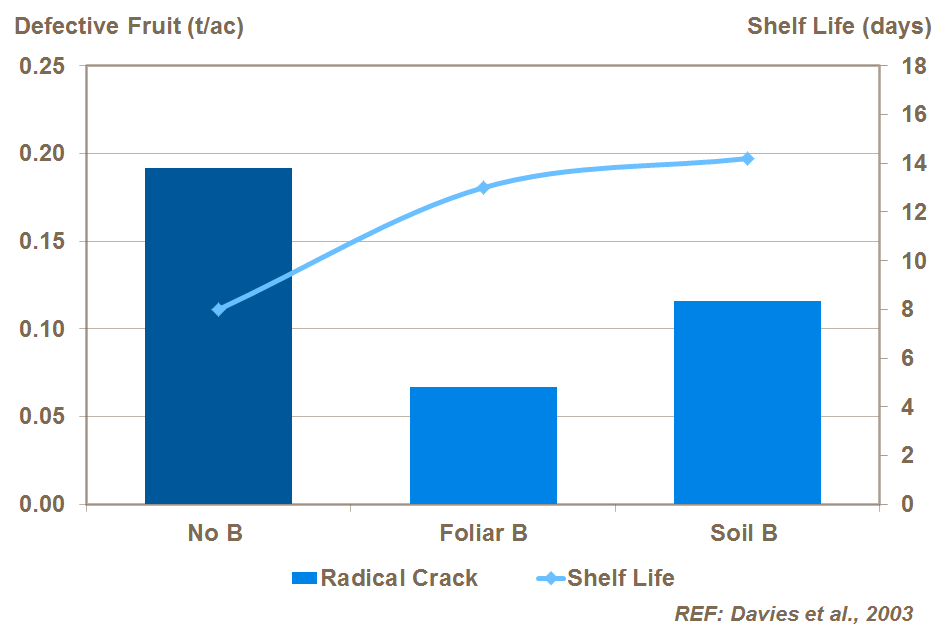 Boron also has a positive influence on the level of cracking and shelf life of the fruit, as USA trial shows. Any cracks on the fruit shoulder increase water loss and susceptibility to pathogen attack.