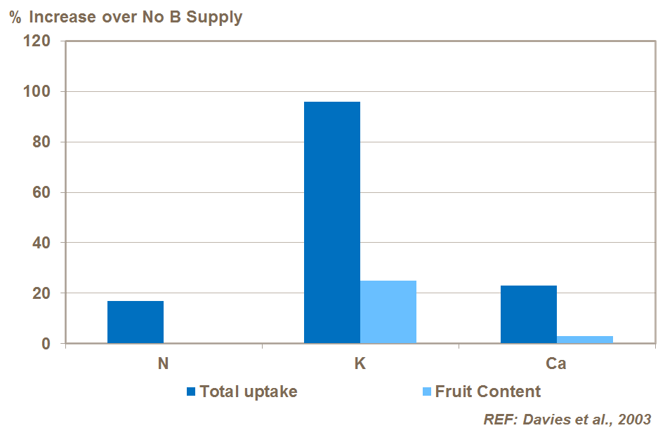 USA trial shows that, if boron is deficient, the uptake of other nutrients, notably nitrogen, potassium and calcium, is reduced.