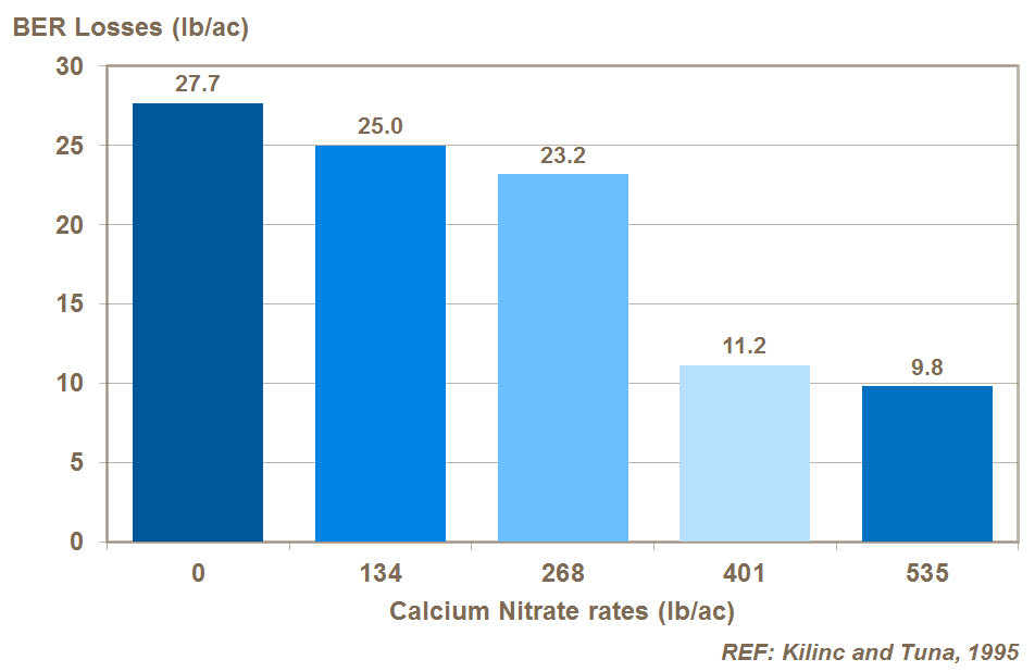 As a general rule, fresh fruit with a calcium concentration of above 0.12% do not develop BER. The best way of ensuring good calcium supply is to use calcium nitrate as the calcium source (see data above from Turkey).