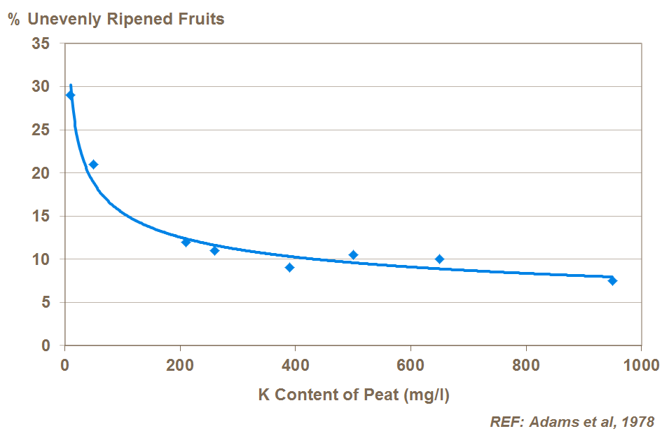 Potassium has an important role in ensuring top quality fruit by determining the level of sugars, as well as ripening and storage characteristics. An inadequate supply of potassium in tomatoes can lead to uneven ripening (UK trials).