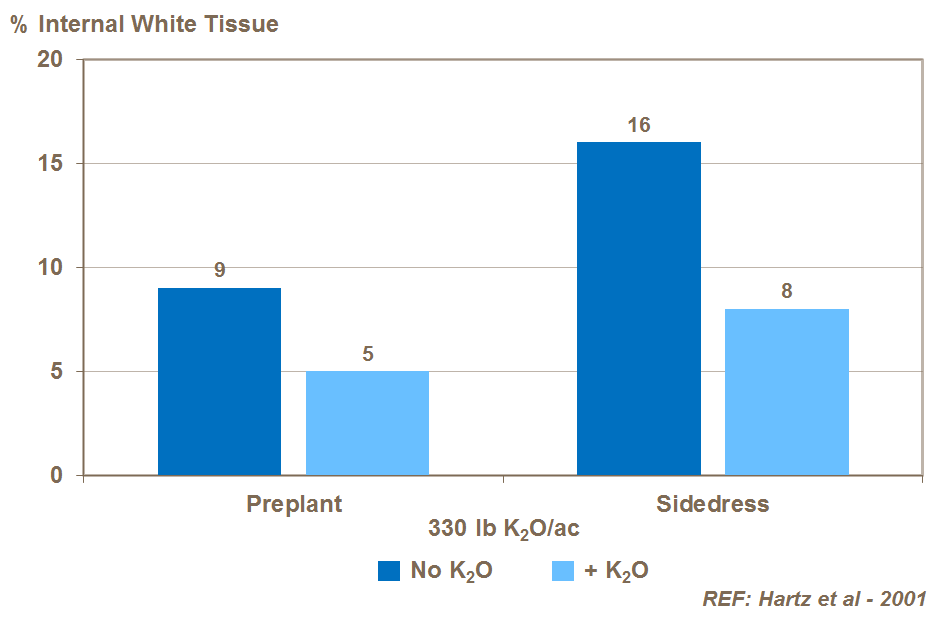 An inadequate level of potassium in tomatoes can also lead to blotchy ripening and color defects such as internal white tissues, as shown in studies in USA.